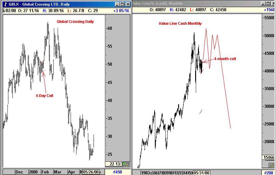 Last fall we commented on the "4-day coil" (successive inside-days, yet with relatively high volatility) in Global Crossing, and suggested that its resolution would set the tone for the high tech market on an ongoing basis. Global Crossing in that instance broke to the topside in a last hurrah rally before collapsing.